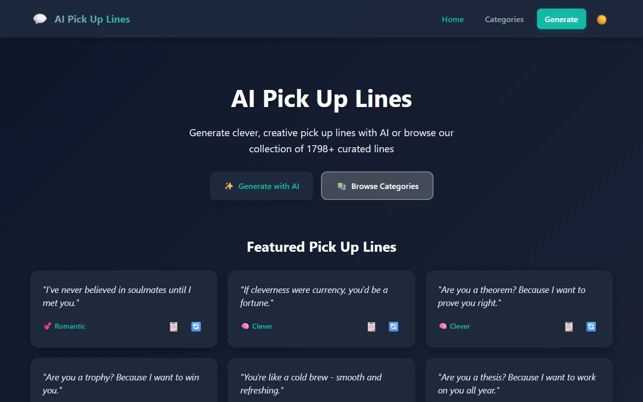 - Customer support: AI Pickup Lines includes a dedicated customer support engine that processes your inputs intelligently. The system learns from each interaction, delivering increasingly personalized and accurate results the more you use it.