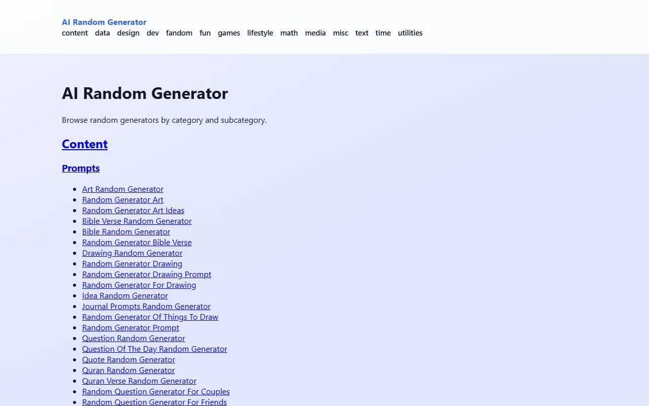 For professionals, teams, and everyday users seeking smarter ways to handle AI-powered assistance and automation, AI Random Generator presents an intriguing proposition. AI Random Generator sparks creativity with diverse random prompts and structured outputs for writing, design, and games. The platform aims to bridge the gap between complex AI technology and practical, everyday utility, making advanced capabilities accessible without requiring deep technical expertise.
