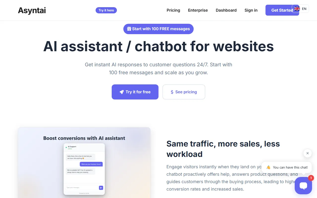 Asyntai: AI live chat agent providing instant, 24/7 multilingual customer support to boost sales and save costs.