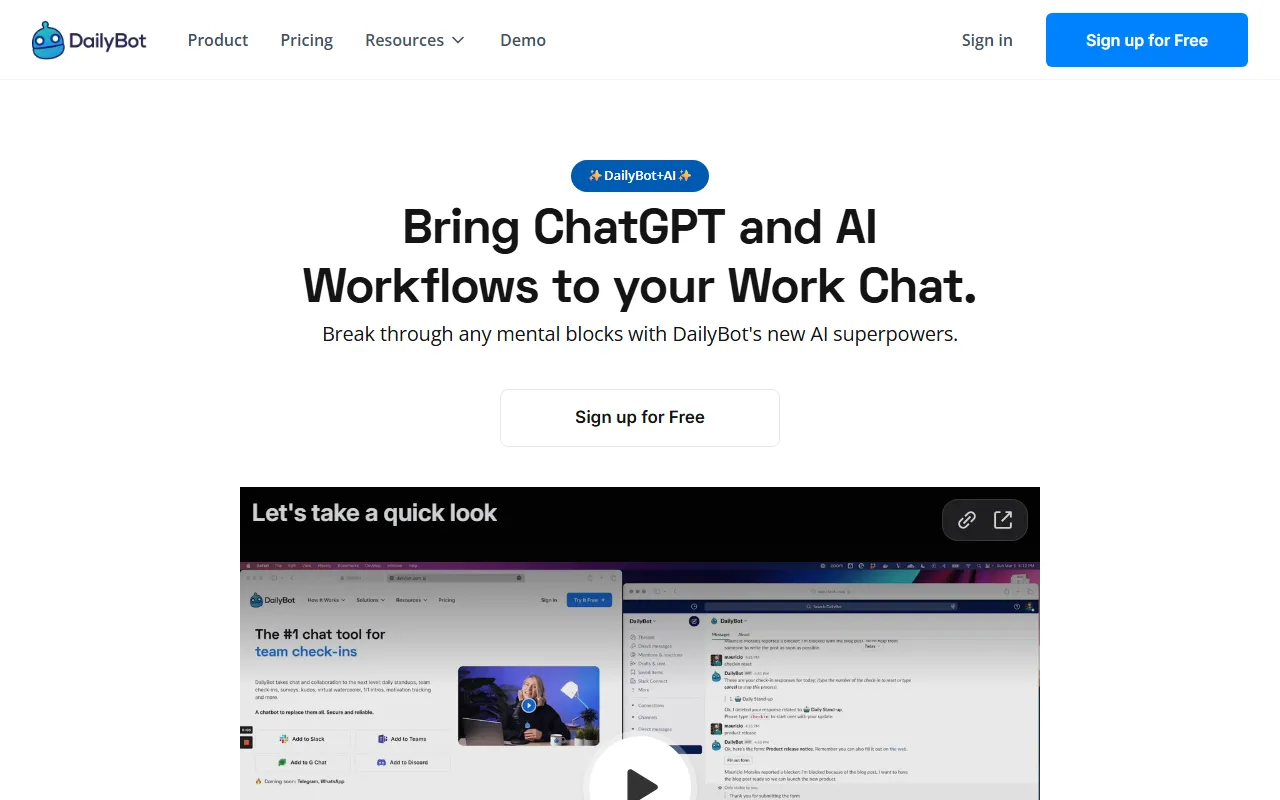 - Conversational AI: DailyBot provides robust conversational ai functionality, allowing users to resolve with precision and efficiency. This feature is powered by advanced AI models that adapt to your specific use case and improve over time based on your interactions.