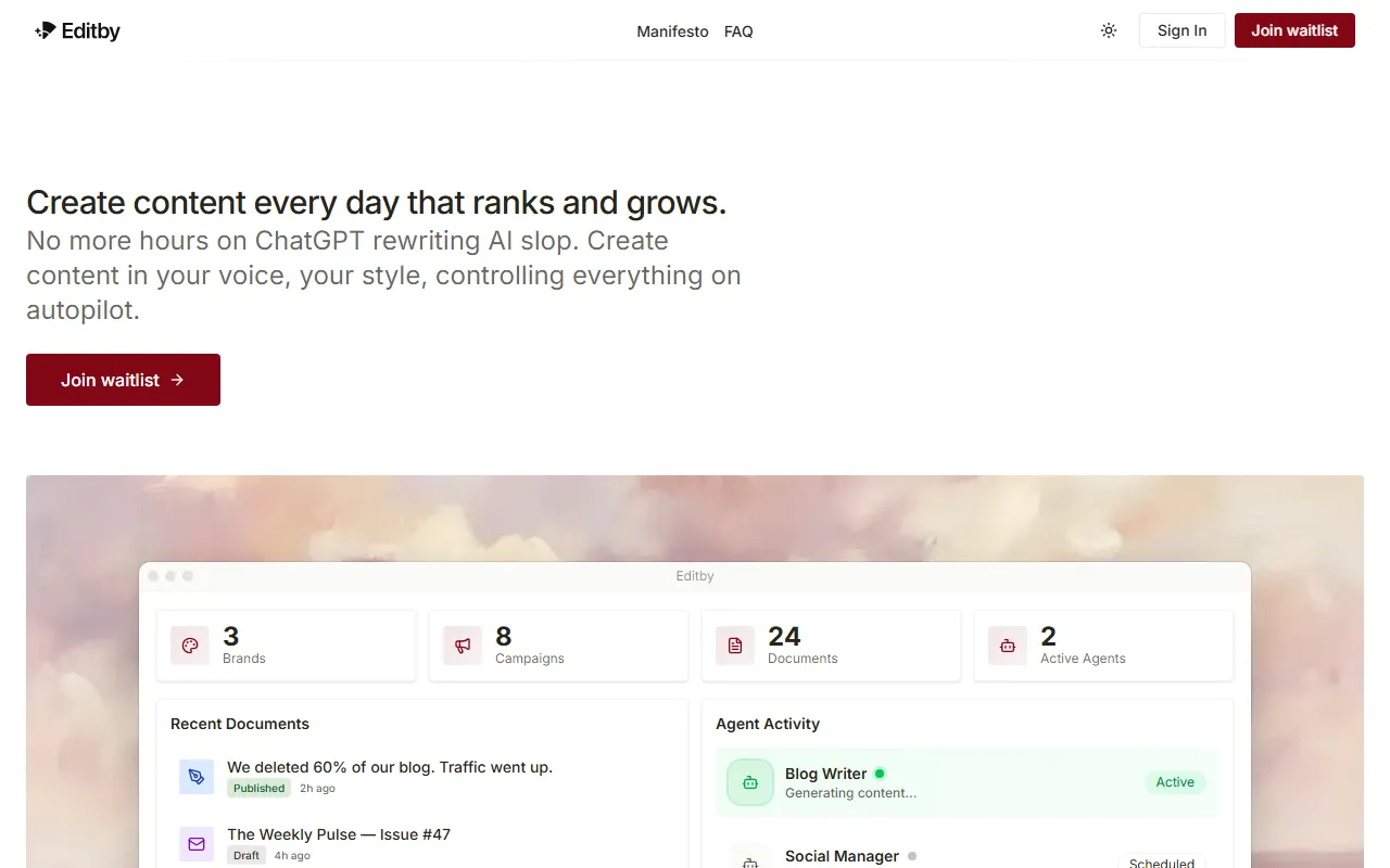 Elevate your online presence effortlessly with Editby's AI-driven content creation and insights.