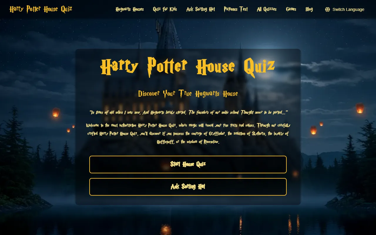 Interactive Harry Potter quiz with AI-powered Sorting Hat, magical design, multi-language support.
