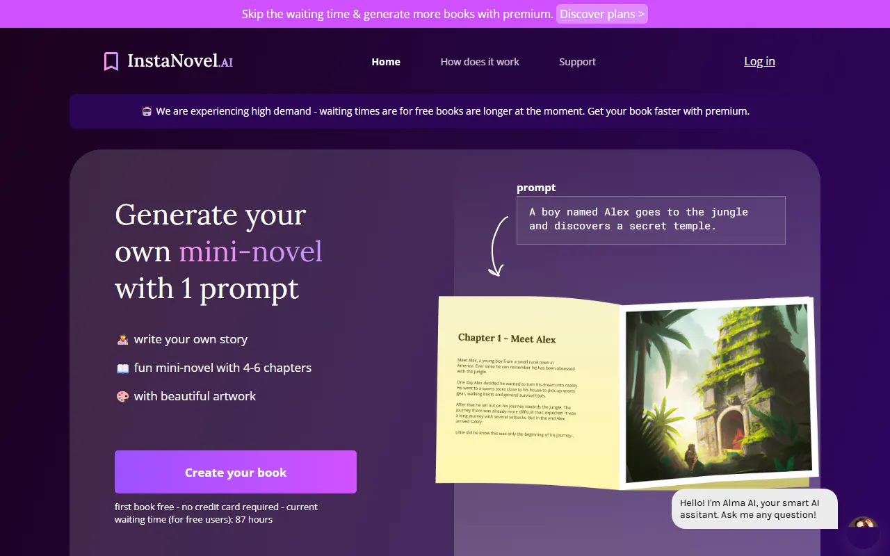 Create stunning mini-novels with vibrant art using just a simple prompt—limit one per user.