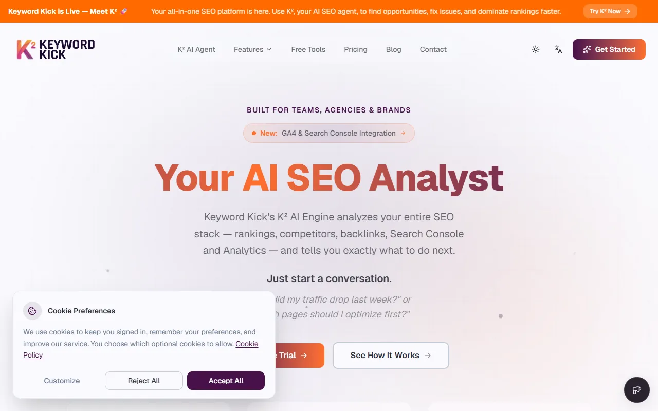 KeywordKick is an AI-powered SEO platform that offers actionable insights, data integration, and comprehensive SEO management.