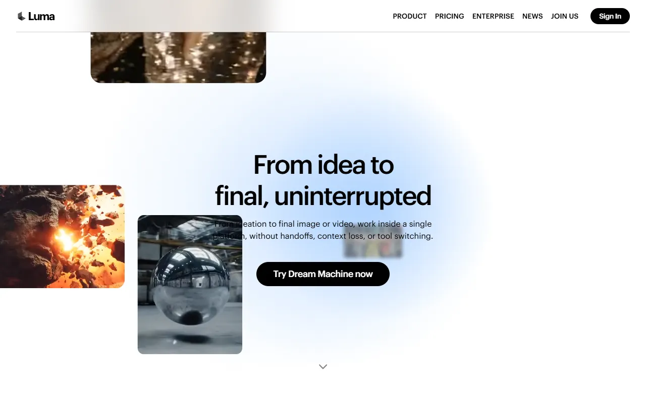 - Video-generation: Luma Dream Machine provides robust video-generation functionality, allowing users to produce with precision and efficiency. This feature is powered by advanced AI models that adapt to your specific use case and improve over time based on your interactions.