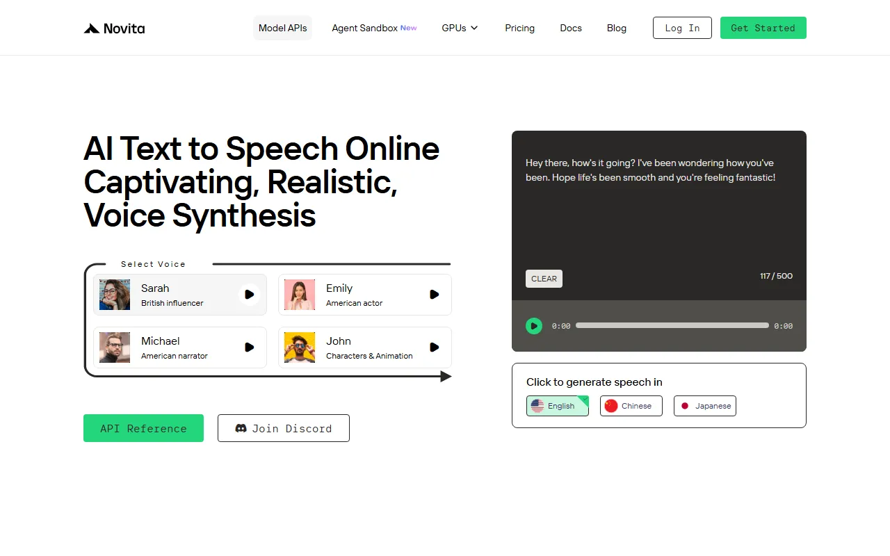 - AI tool collections: Novita AI Text to Speech API provides robust ai tool collections functionality, allowing users to process with precision and efficiency. This feature is powered by advanced AI models that adapt to your specific use case and improve over time based on your interactions.