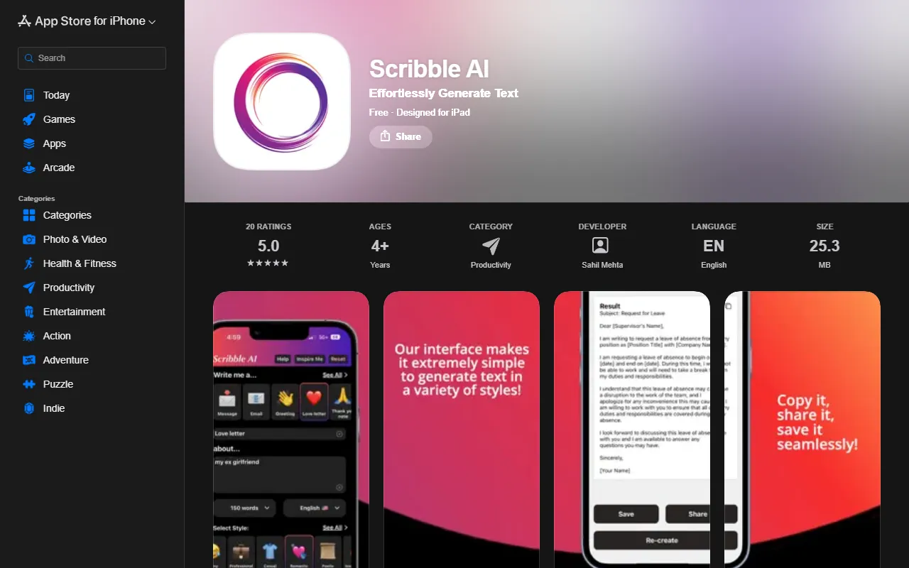 https://apps.apple.com/us/app/scribble-ai/id1662081018Released
