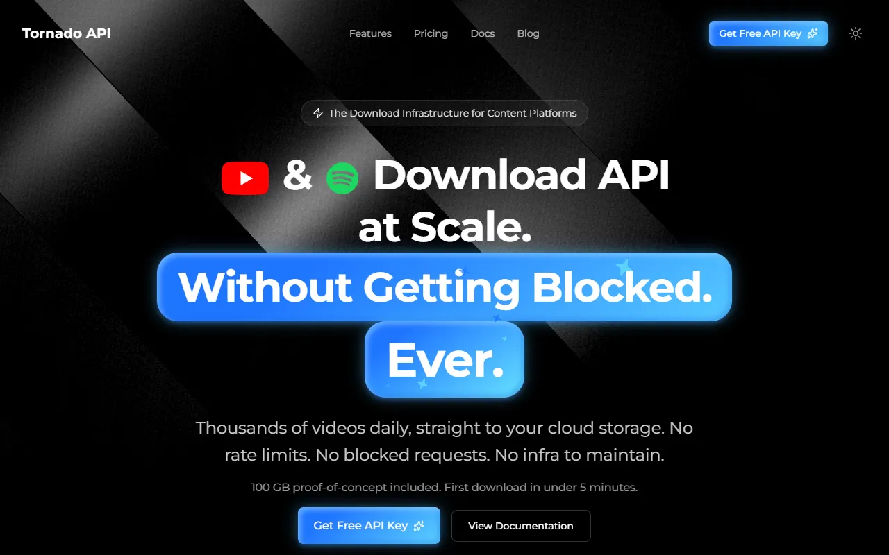Tornado API enables scalable, reliable bulk YouTube and Spotify media downloads without bot blocks or proxies.