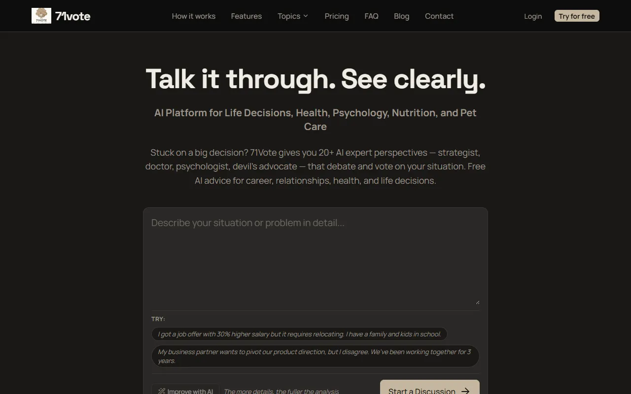 71vote offers real-time multi-agent discussions to explore challenges with expert AI perspectives.