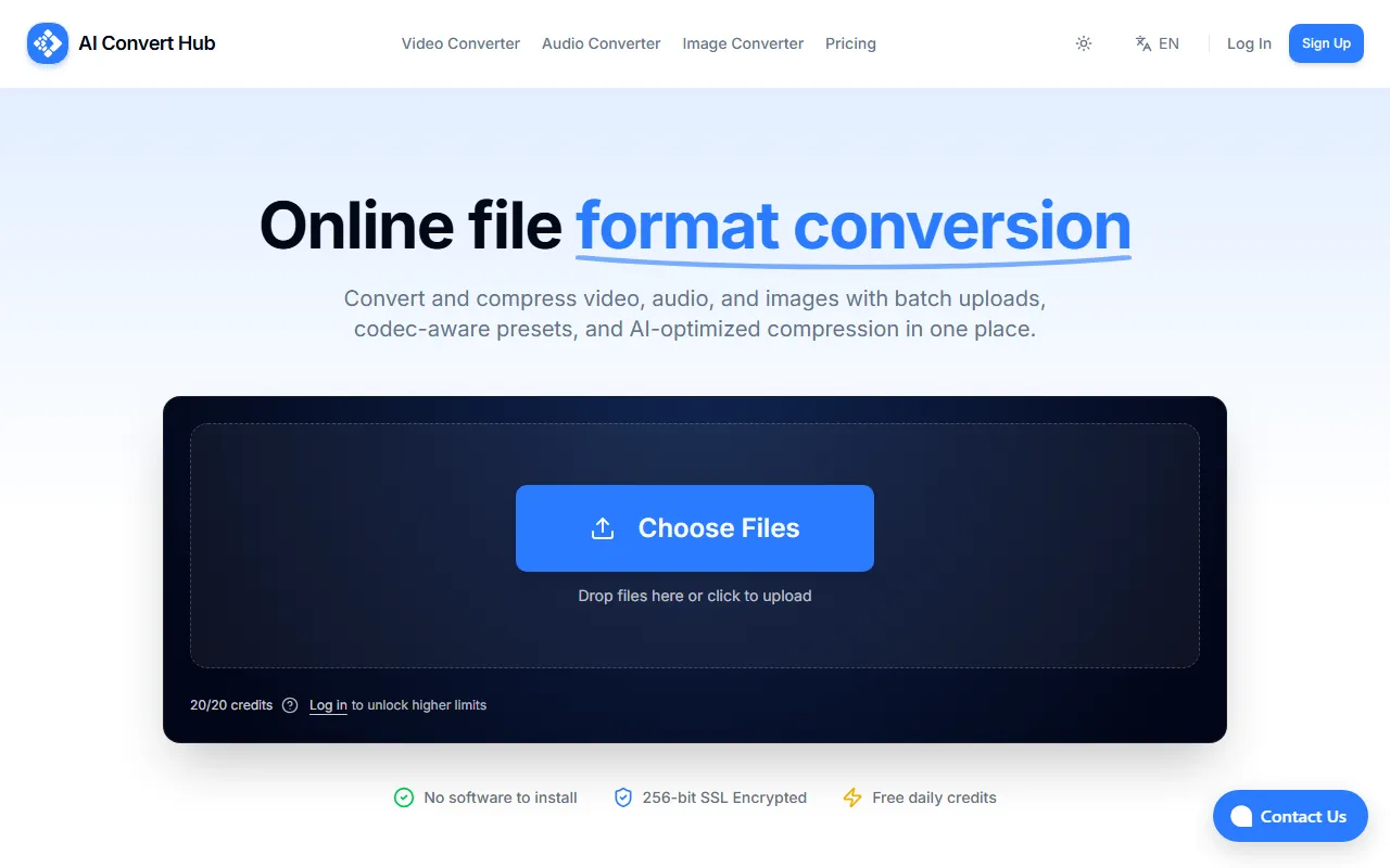 AI Convert Hub: fast, secure online converter/compressor for 200+ video, audio, image formats.