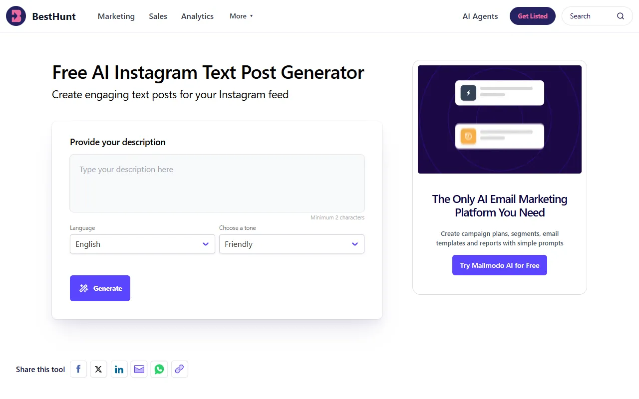 - AI marketplaces: With built-in ai marketplaces capabilities, AI Instagram Text Post Generator helps marketers, growth hackers, and brand managers tackle this aspect of their workflow head-on. The AI-driven approach ensures consistent, high-quality output every time while reducing manual effort significantly.
