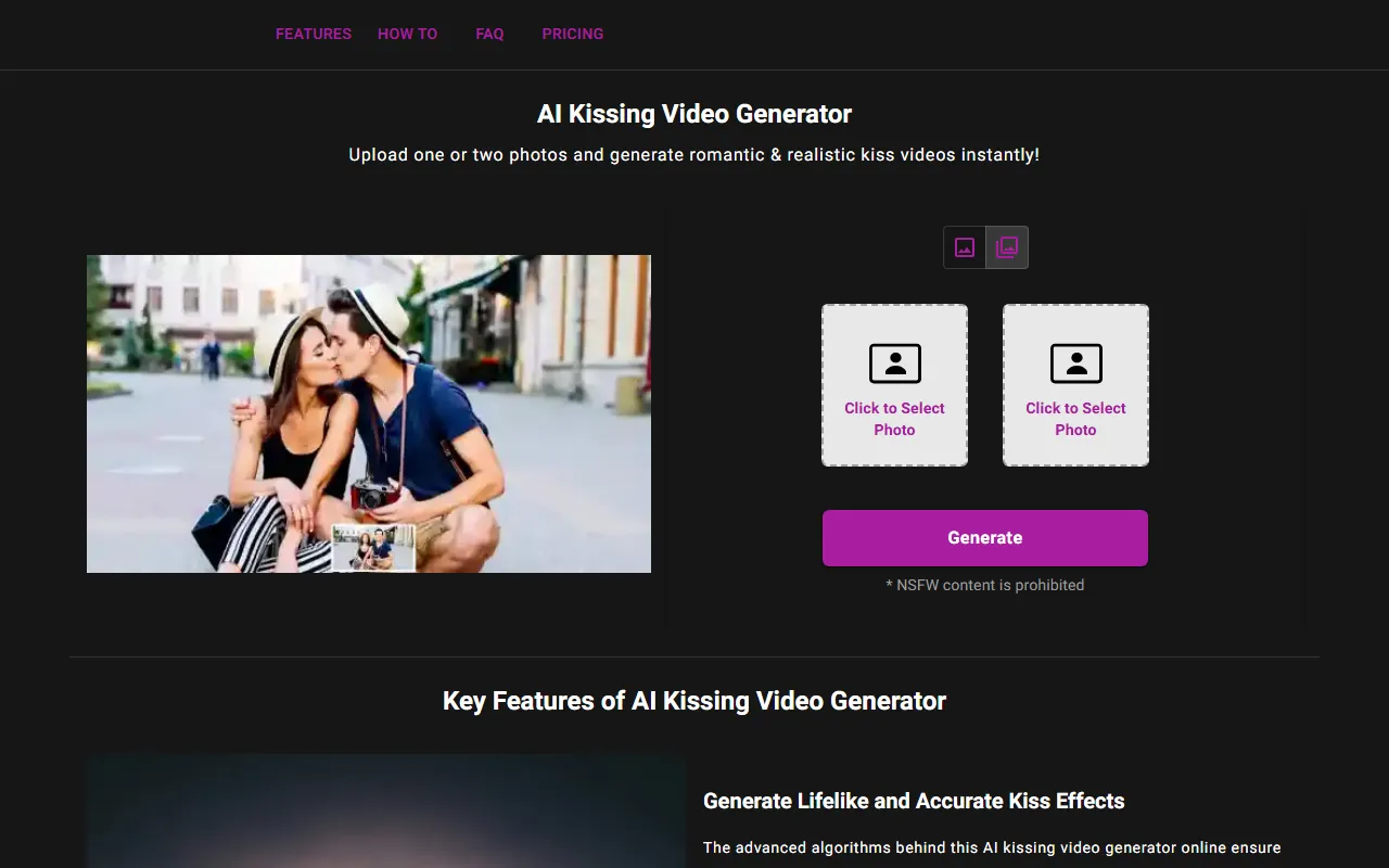Create lifelike kiss animations instantly from photos—romantic, free, and no login required.