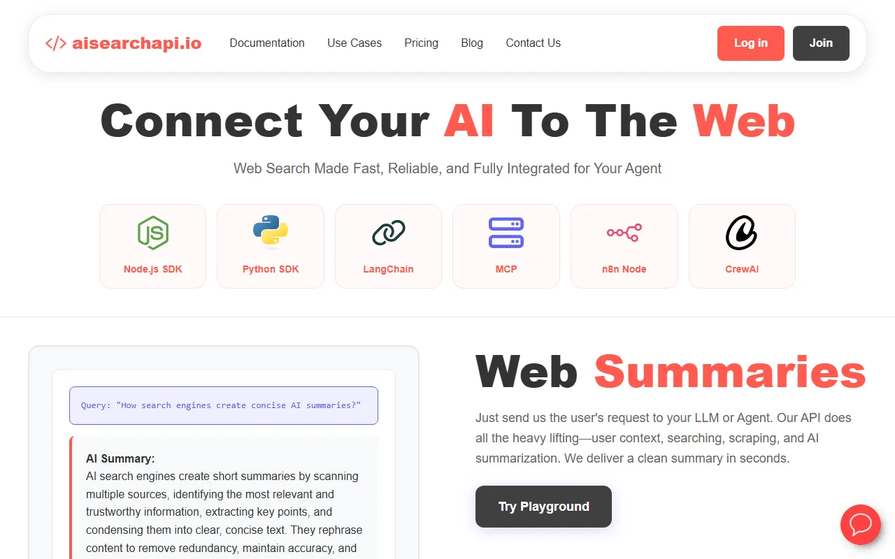 Cost-effective AI search API delivers live web data, context, and summaries for seamless LLM integration.