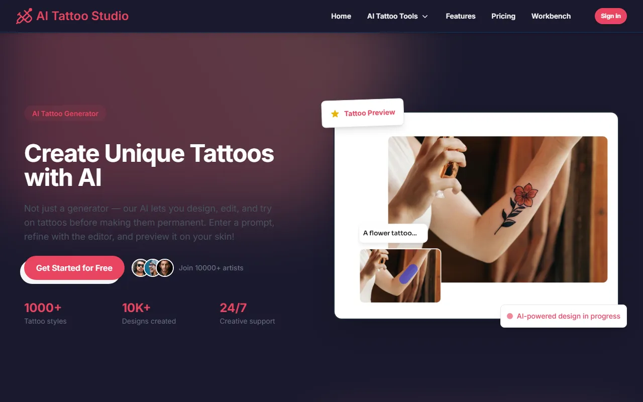 AI Tattoo Studio: Design, customize, and realistically preview unique tattoos with AI-powered tools.