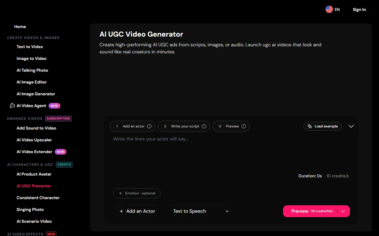 - Video editing: Ai UGC includes a dedicated video editing engine that processes your inputs intelligently. The system learns from each interaction, delivering increasingly personalized and accurate results the more you use it.