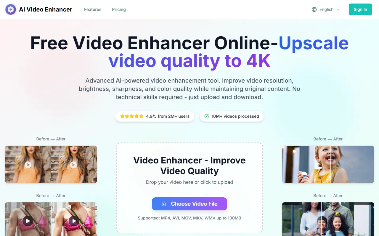 AI-powered tool enhances video resolution, brightness, sharpness, and color with ease.