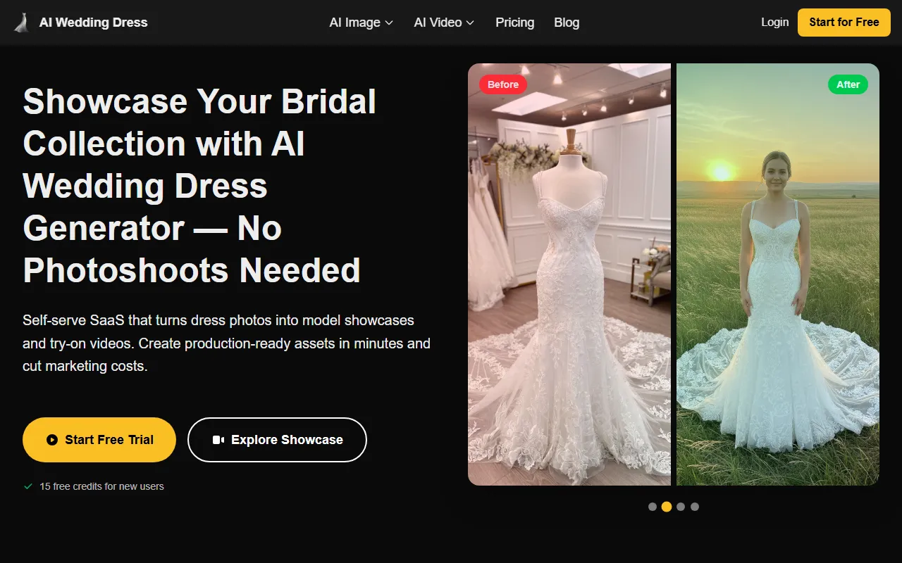 AI Wedding Dress transforms bridal gown photos into photorealistic model images and videos instantly.