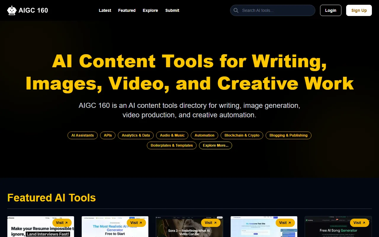 AIGC 160 curates top AI tools for content creation, boosting creativity and productivity effortlessly.