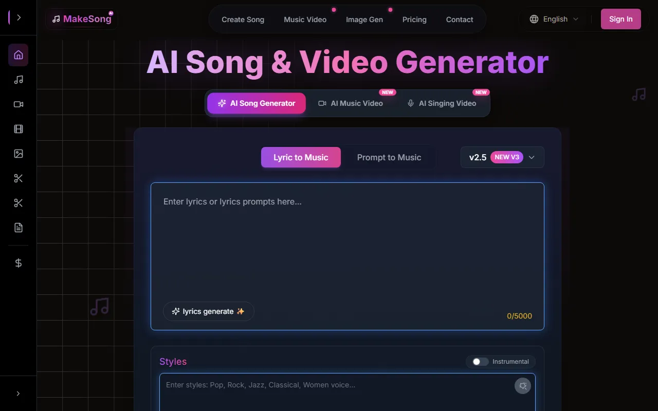 MakeSong generates royalty-free AI music from text or lyrics instantly in any style.