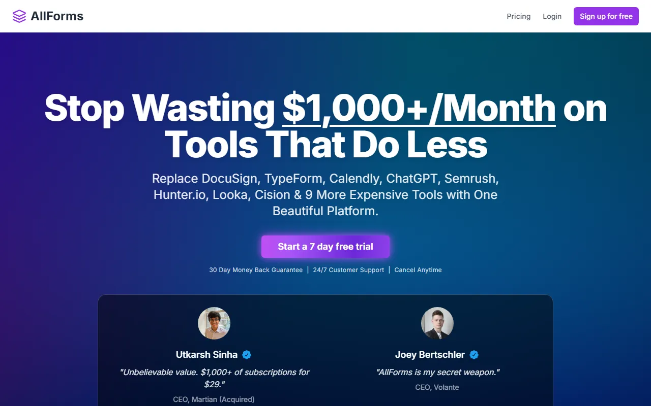 AllForms: all-in-one SaaS with e-signatures, scheduling, AI chat, SEO—boosts productivity and cuts costs.