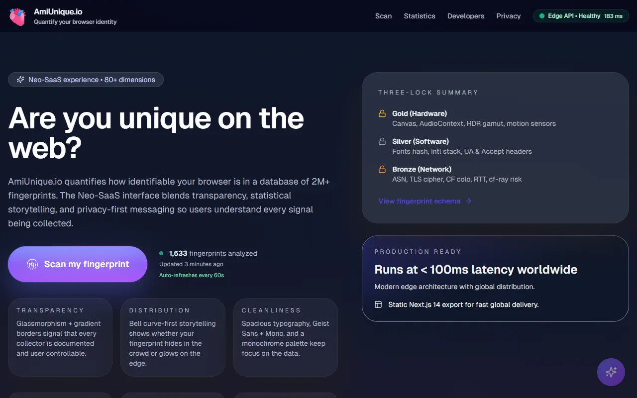 AmiUnique.io reveals your browser’s digital fingerprint, enhancing privacy, security, and fraud detection.