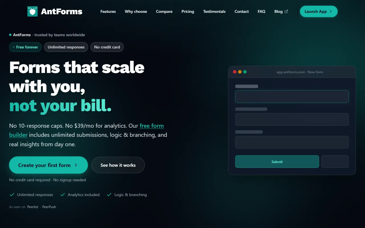 AntForms: unlimited, no-code form builder with powerful analytics and secure data control.