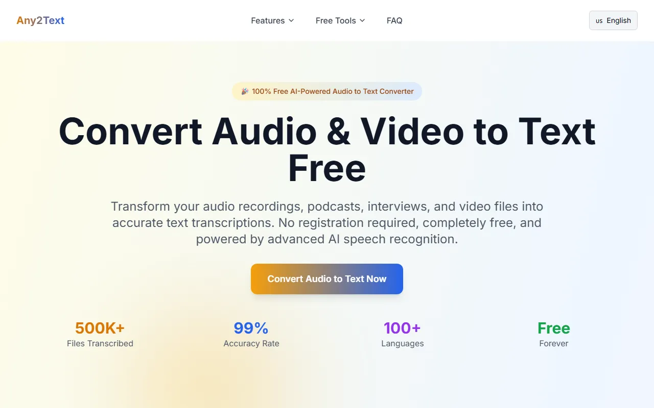 Any2Text: free, fast AI transcription for 100+ languages with privacy and no signup needed.