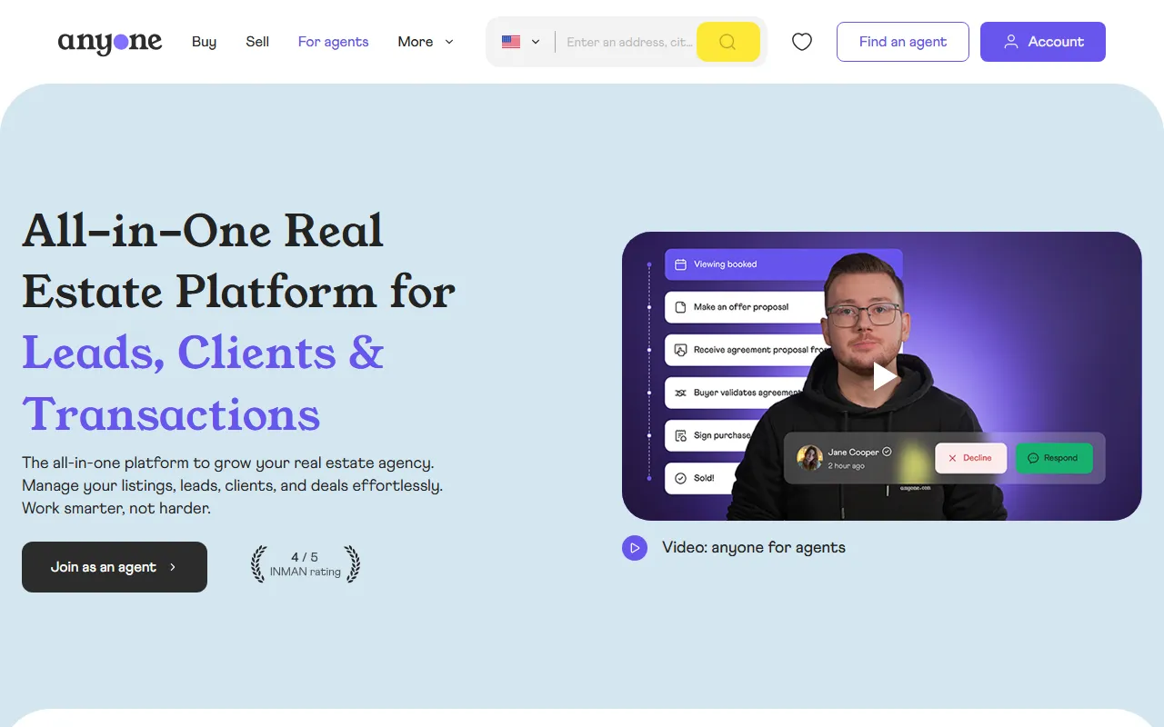 Anyone.com is a commission-free real estate platform connecting buyers, sellers, and agents with seamless AI-driven tools.