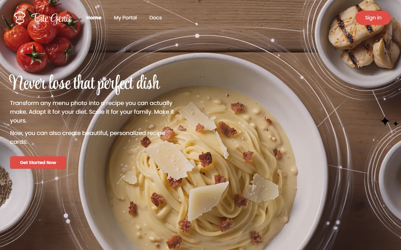 BiteGenie turns menu photos into AI-generated recipes with smart organization and stylish sharing.