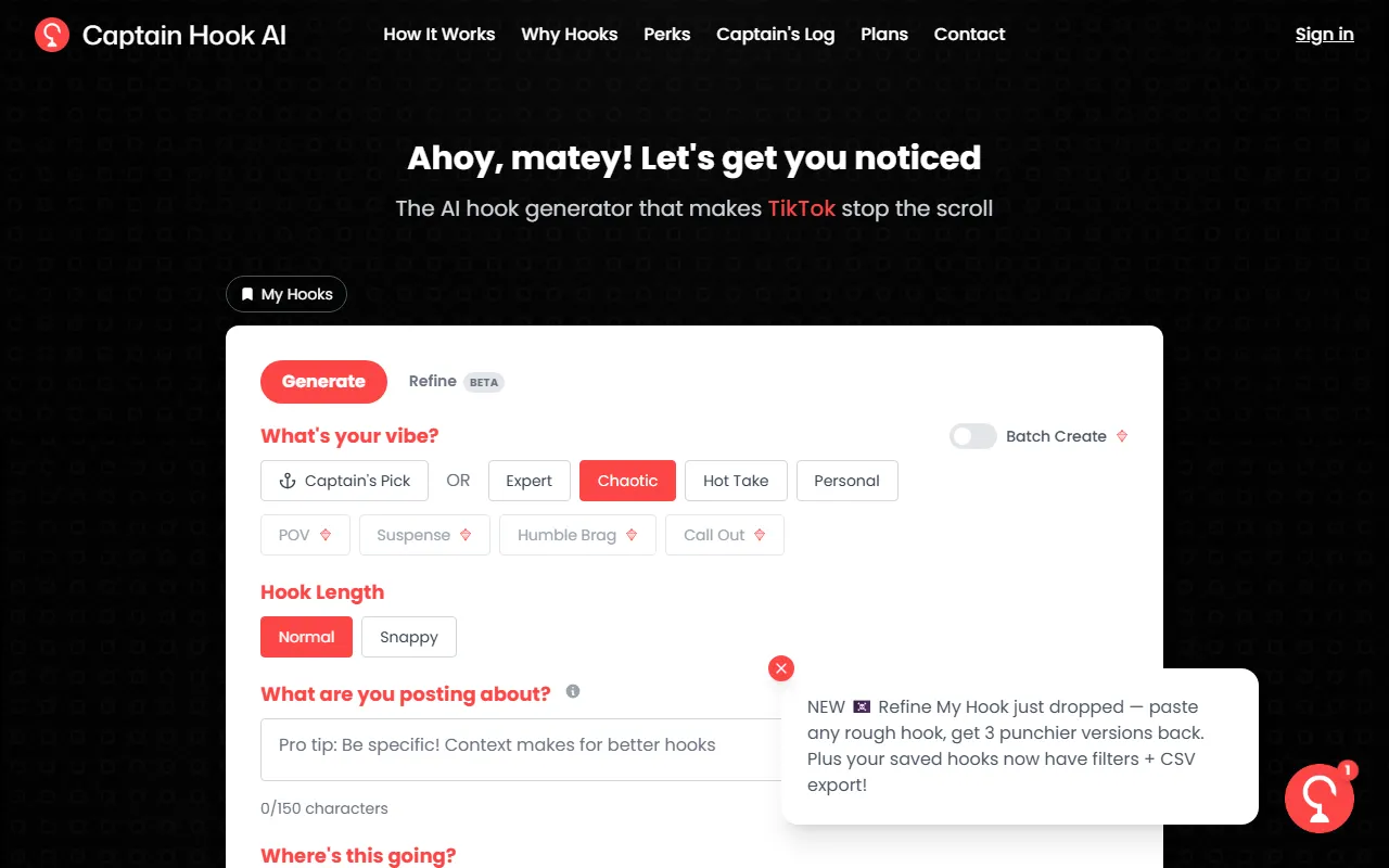 Captain Hook AI crafts viral, platform-specific social media hooks to boost content visibility.