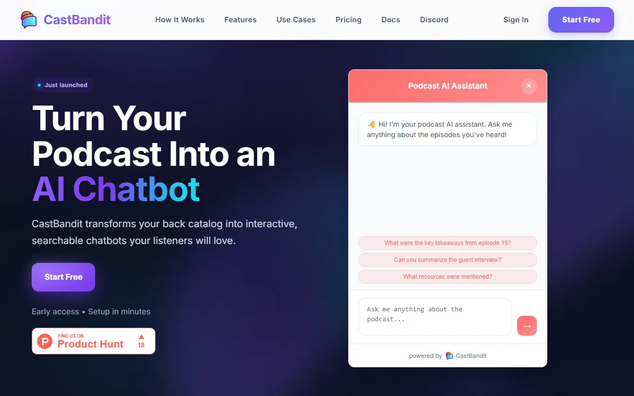 CastBandit transforms podcasts into AI chatbots that answer questions and boost episode discovery.