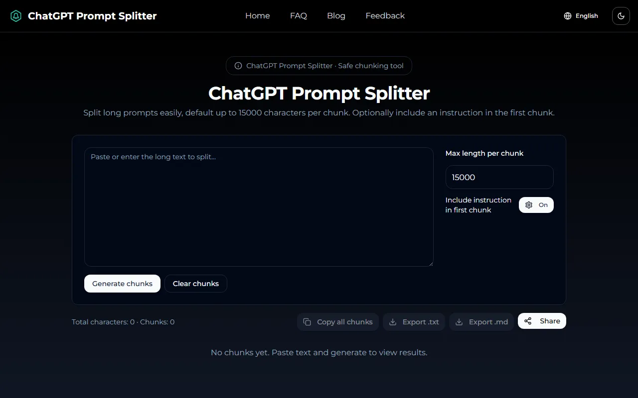 Easily split long prompts into smaller, manageable chunks for seamless AI input limits.