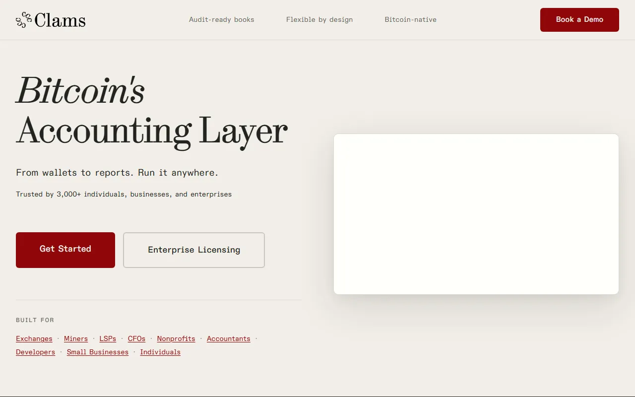 Clams offers privacy-focused, Bitcoin-native double-entry accounting with automated reconciliation and detailed reporting.
