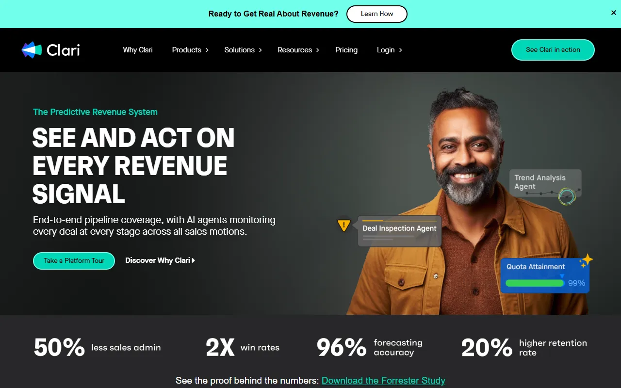 - Sales analytics: Clari includes a dedicated sales analytics engine that processes your inputs intelligently. The system learns from each interaction, delivering increasingly personalized and accurate results the more you use it.