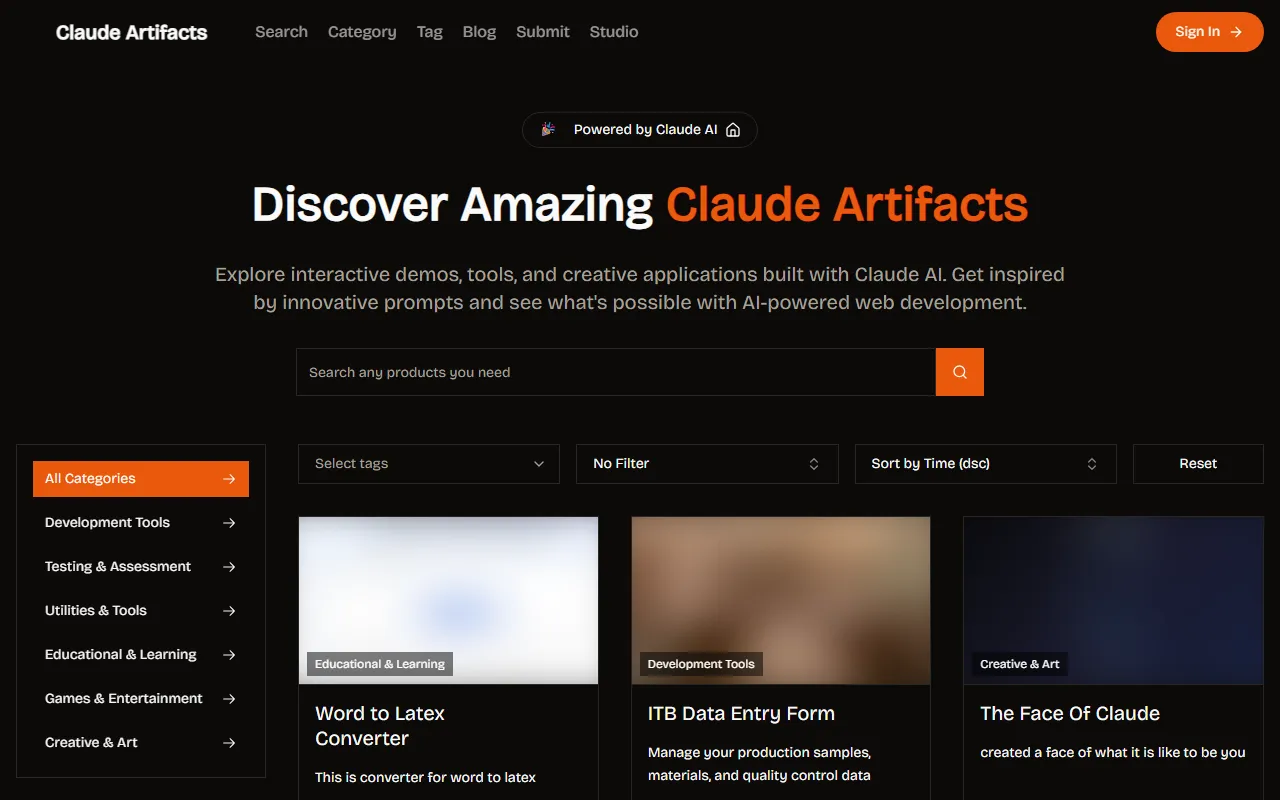 Claude Artifacts: a community hub showcasing diverse, creative AI outputs from Anthropic’s Claude model.