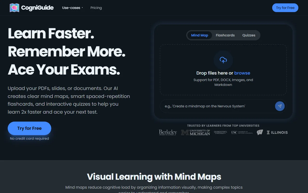 CogniGuide transforms PDFs into AI-generated mind maps and flashcards for fast, effective learning.
