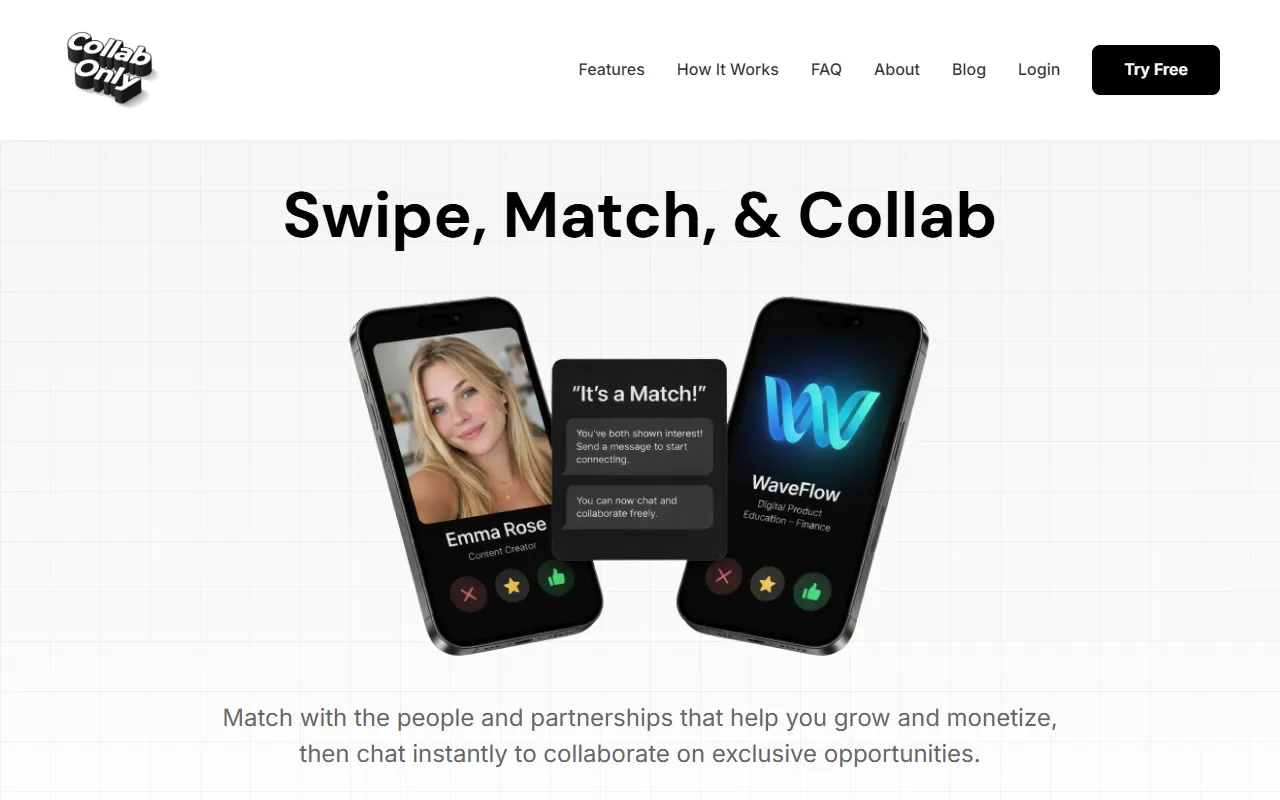 Collab Only: Swipe to discover and match creators, brands, and businesses for seamless collaborations.