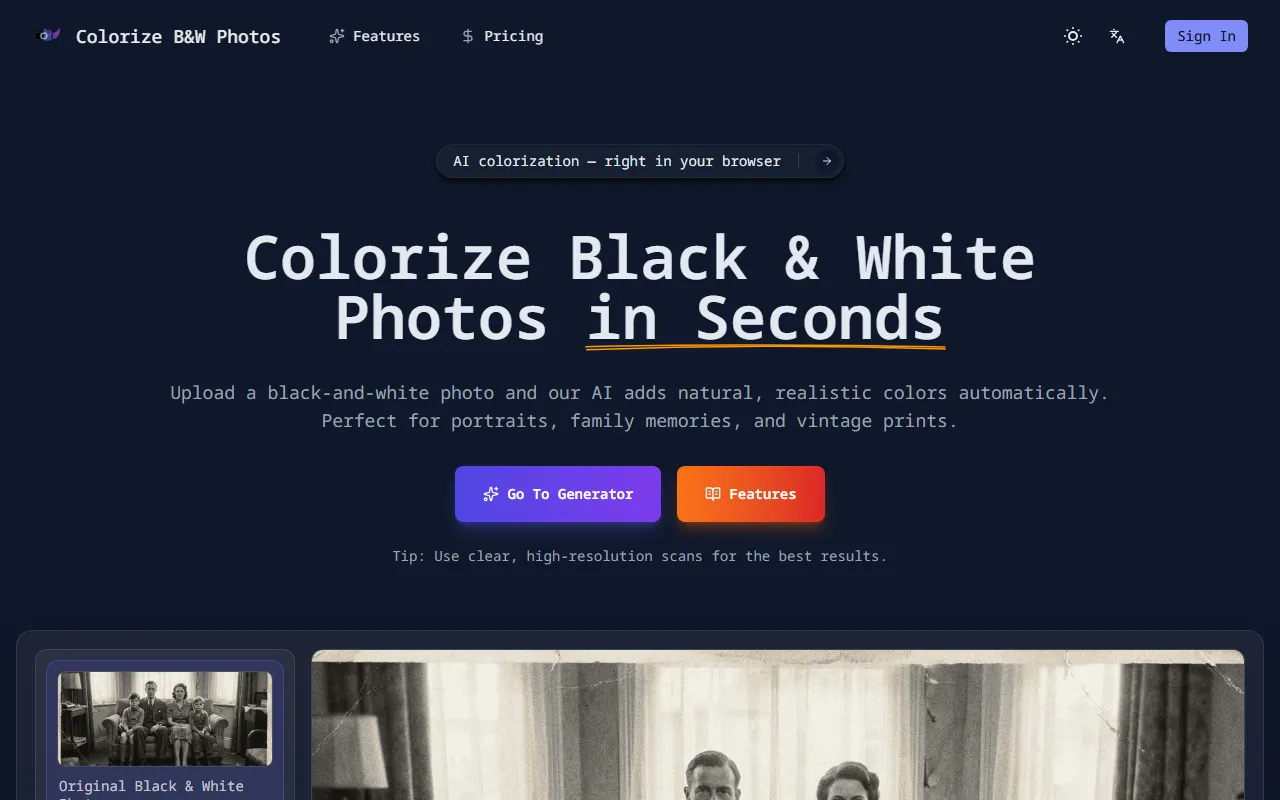 Colorize Black And White Photos is best suited for designers, artists, and creative professionals who want to generate more efficiently without a steep learning curve. The platform is particularly effective for individuals and small teams who need professional-grade visual content but lack the resources to hire specialized staff or invest in enterprise-level solutions.