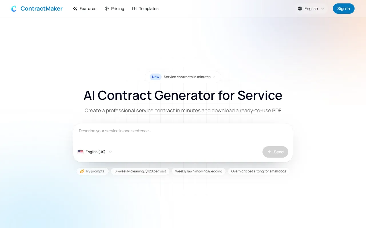 ContractMaker creates tailored, complete service contracts quickly using clear clauses and AI refinement.