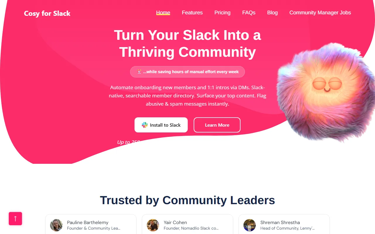Streamline Slack community management with automated onboarding, member connections, directories, content highlights, and moderation.