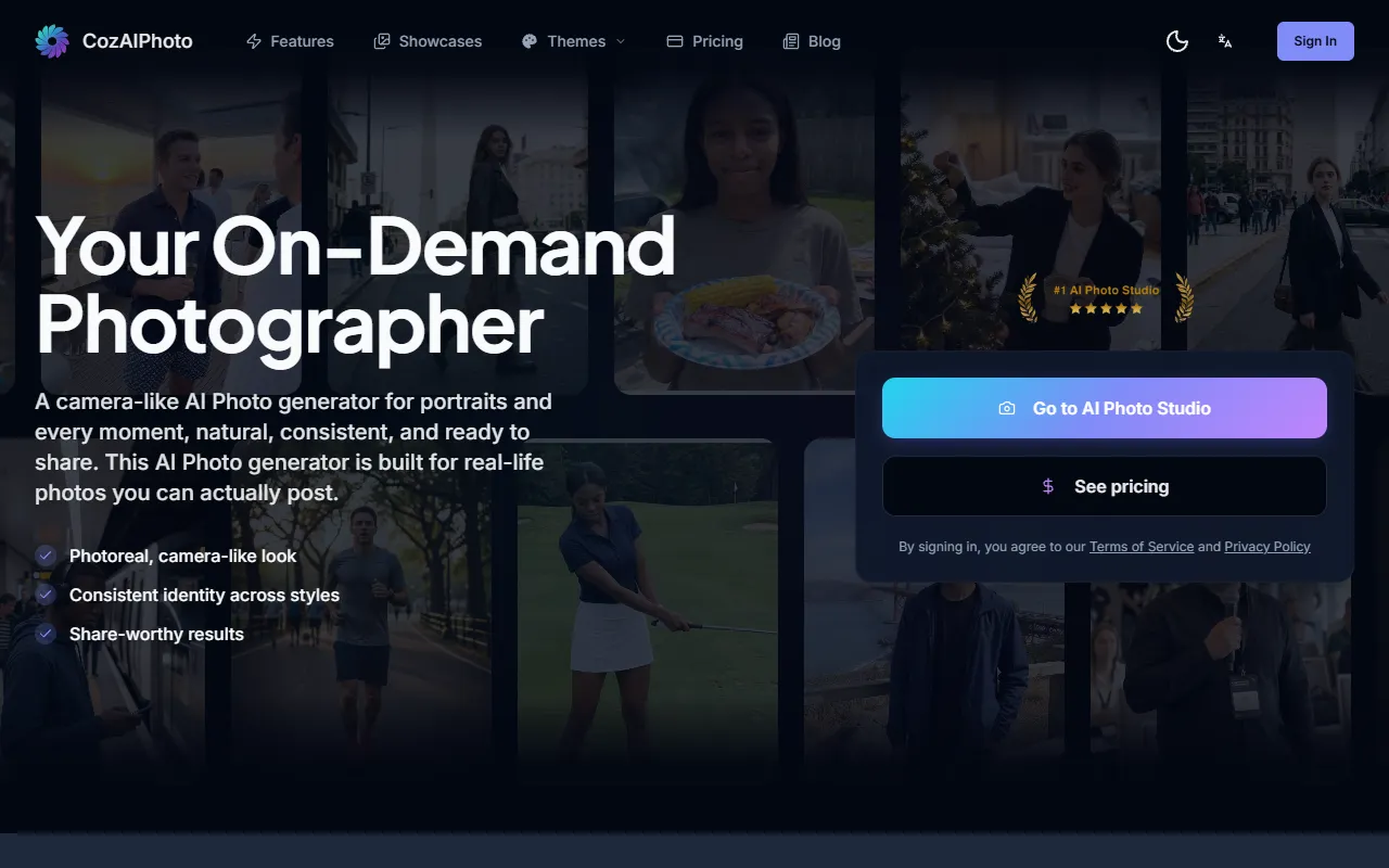 CozAIPhoto generates camera-realistic portraits in minutes with consistent identity and style variety.