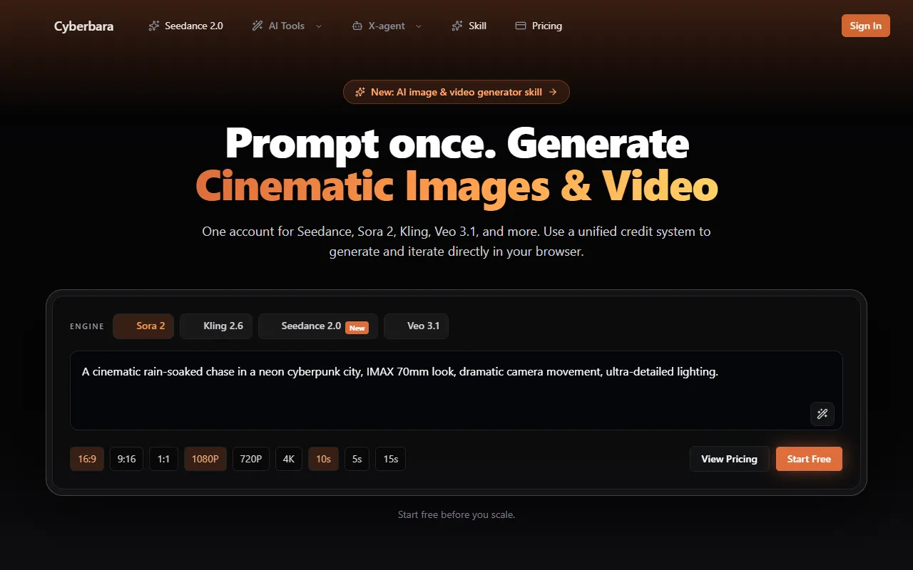Seedance 2.0 on CyberBara: all-in-one AI video/image creator with multi-engine access, streamlined workflow, and commercial rights.