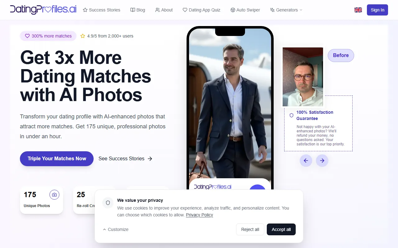DatingProfiles.ai boosts dating success by creating 175 AI-enhanced, professional profile photos fast.