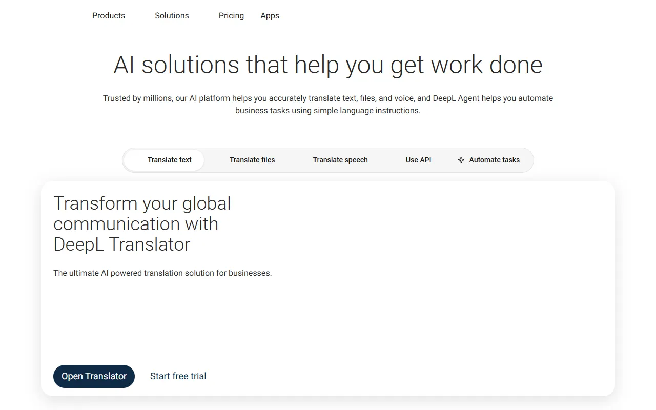 - Translation: DeepL provides robust translation functionality, allowing users to assist with precision and efficiency. This feature is powered by advanced AI models that adapt to your specific use case and improve over time based on your interactions.