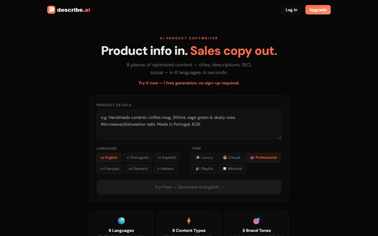 DescribeAI instantly creates SEO-optimized, multilingual product copy with customizable brand tones.