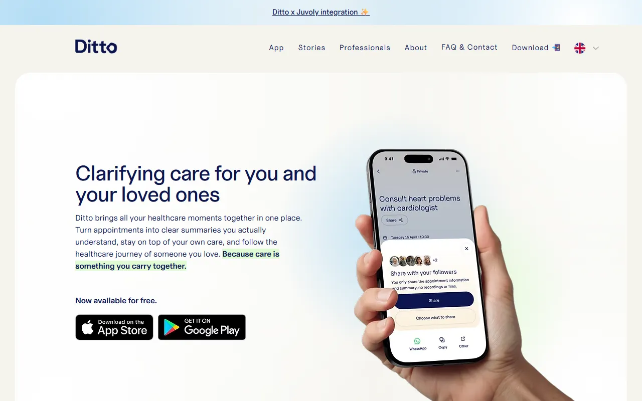 Ditto Care: AI health companion records appointments, simplifies medical info, ensures secure sharing.