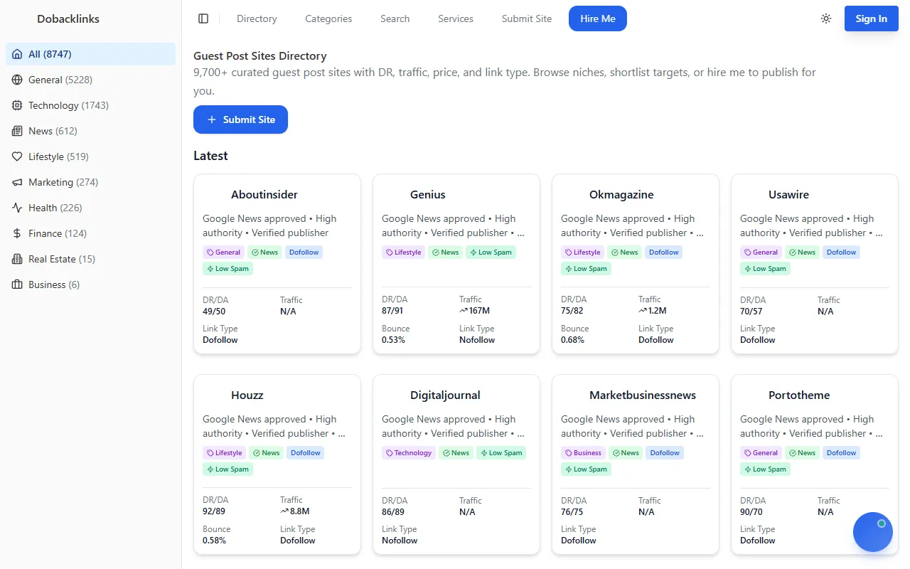 DoBacklinks offers 9,700+ vetted guest-post sites with quality metrics for effective backlink outreach.