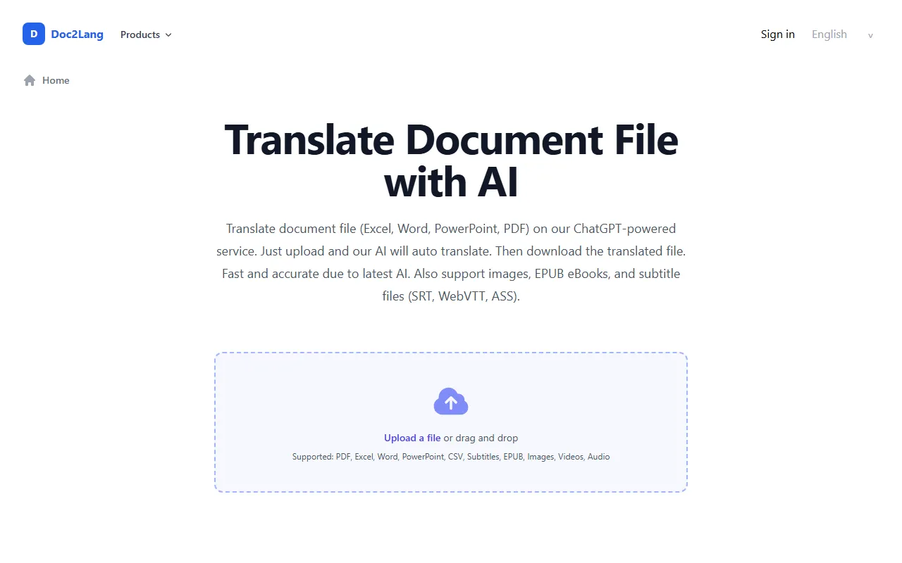 AI-powered service for fast, accurate translation of documents, PDFs, spreadsheets, presentations, and subtitles.