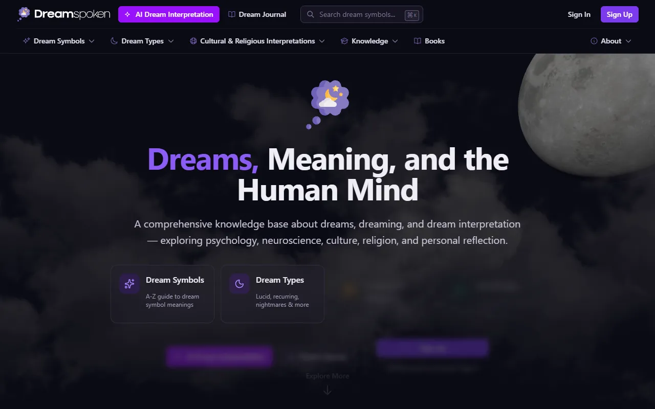 Dreamspoken is an educational platform offering dream analysis, psychology insights, and personalized dream journaling.
