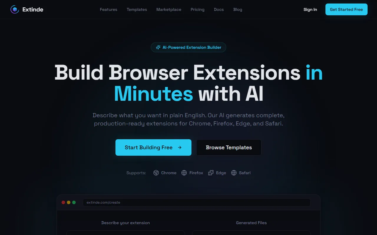 Extinde: AI-driven platform enabling easy, fast creation and distribution of browser extensions without coding.